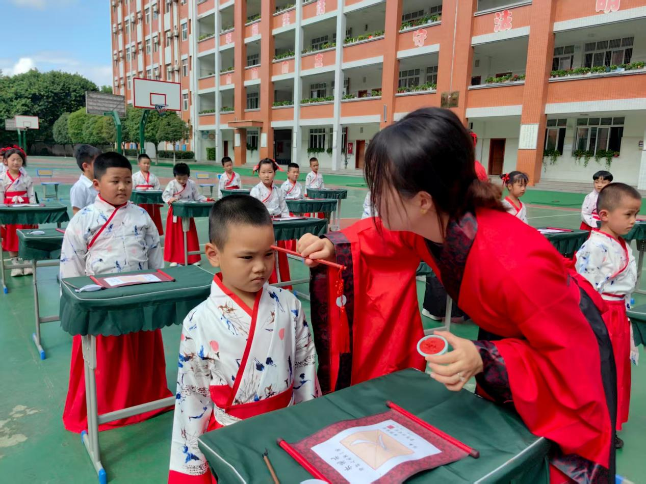 “朱砂启智”环节将仪式推向高潮。老师们用朱砂笔在学童额前轻点红痣,寓意开启智慧、心明眼亮。随后进行的“击鼓鸣志”由学校德育部杨主任击鼓三通,学生跟随宣誓:“尊敬师长”“热爱学习”“为校争光”,铿锵鼓声与稚嫩誓言交融,彰显出新学子远大志向。